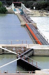 Lock weir for regulation of water flow. Lock chamber for allowing navigation.